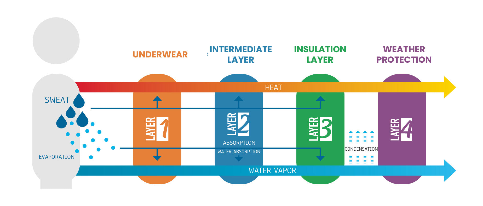 A clothing concept for all temperatures and weather conditions throughout the year. With the 4 defined layers, maximum comfort is guaranteed. Different polyester fibers are used, which meet the required cooling in the active phase, but also a quick re-drying time in the rest phase.